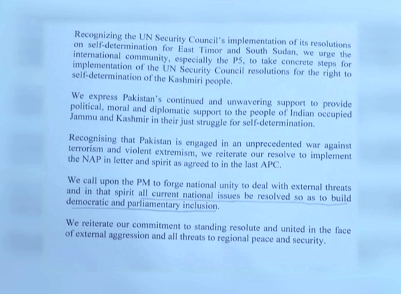 As written in the joint communiqué released after the conference, all the parliamentary parties agreed to establishment of a committee over national security amidst the brewing tensions with India which has cost the region 19th Summit of South Asian Association for Regional Cooperation among blows to different peace efforts.