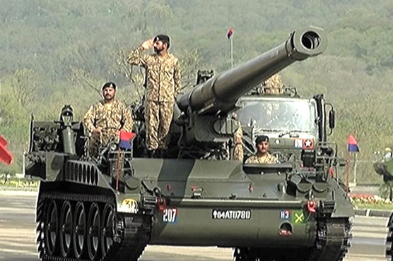 Troops of Pakistan Army, Navy, Air Force and paramilitary conducted march past alongwith war equipment.
