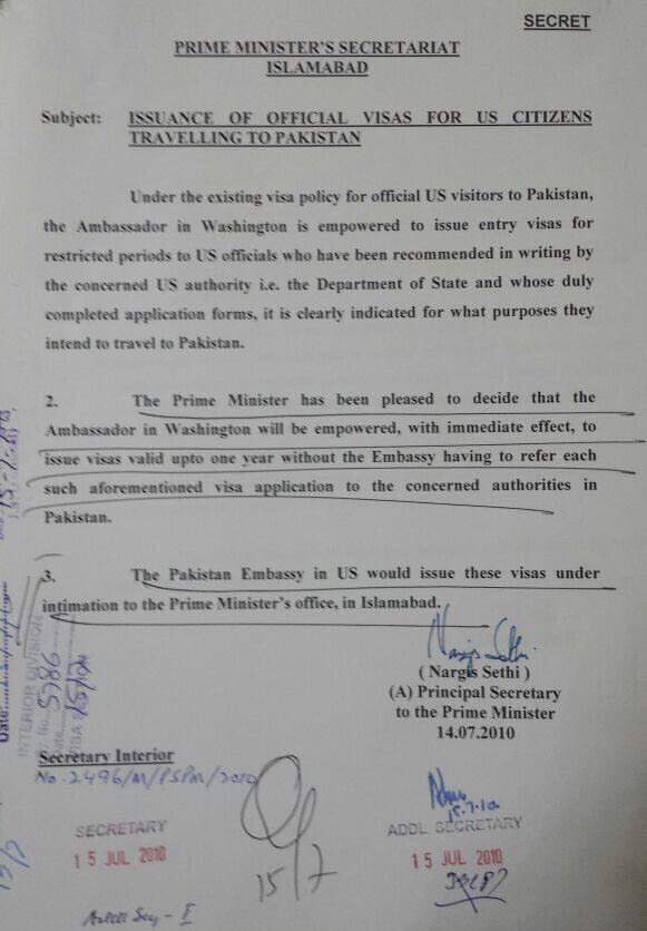Dunya News has obtained copy of PM House letter, signed by former principal secretary Nargis Sethi. In the letter, issued on July 14, 2010, Yousuf Raza Gilani had authorized Hussain Haqqani to issue entry visa to any American citizen for a period of one year.