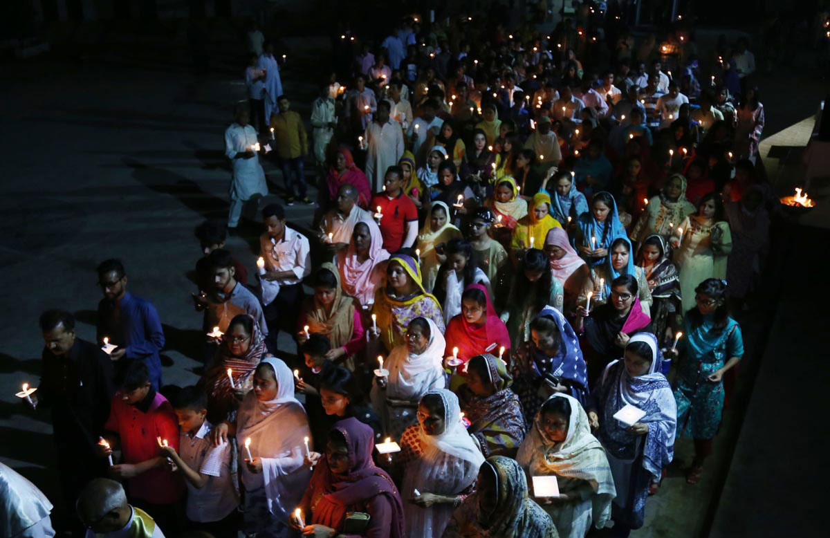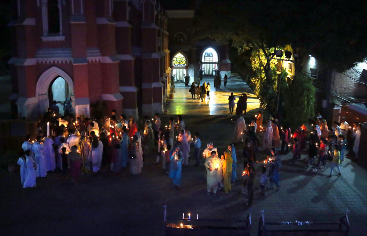 Members of christian community attend Easter Vigil Service at church in Lahore.