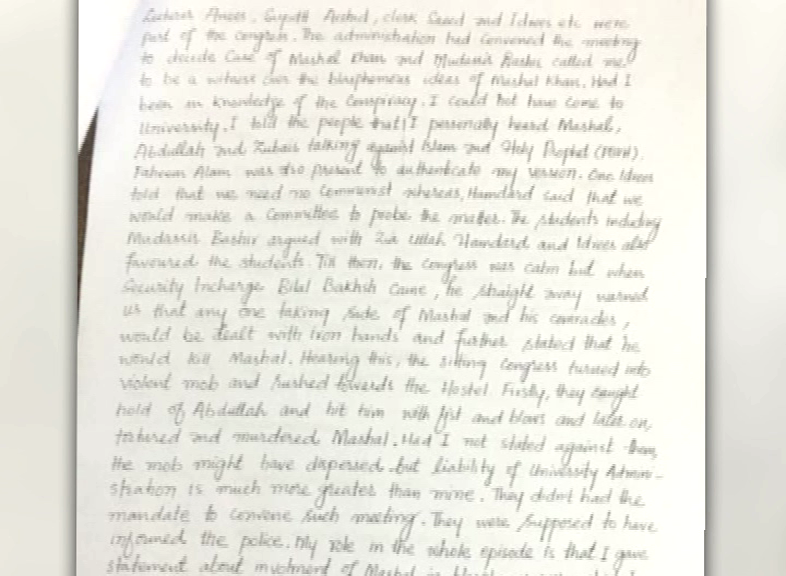 MARDAN (Dunya News) – Prime accused in Mashal Khan lynching case, Wajahat Ullah has maintained in his statement before the police that he opposed the views reserved by the victim and security incharge Bilal Bakhsh incited the group to murder the student.