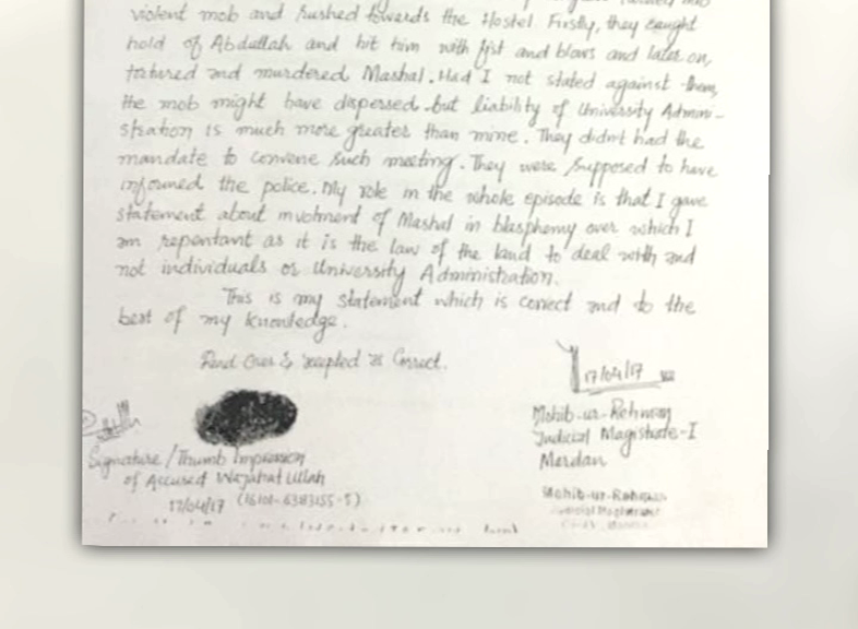 Wajahat stated that had he not given a statement against Mashal in the office of the chairman, the charged mob would have dispersed.