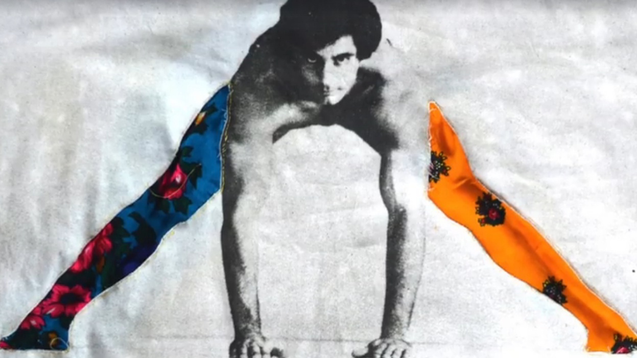 He took pictures of professional body builders, cut out parts of their bodies linked with being strong, such as muscled arms and legs, and replaced them with flowery textiles.