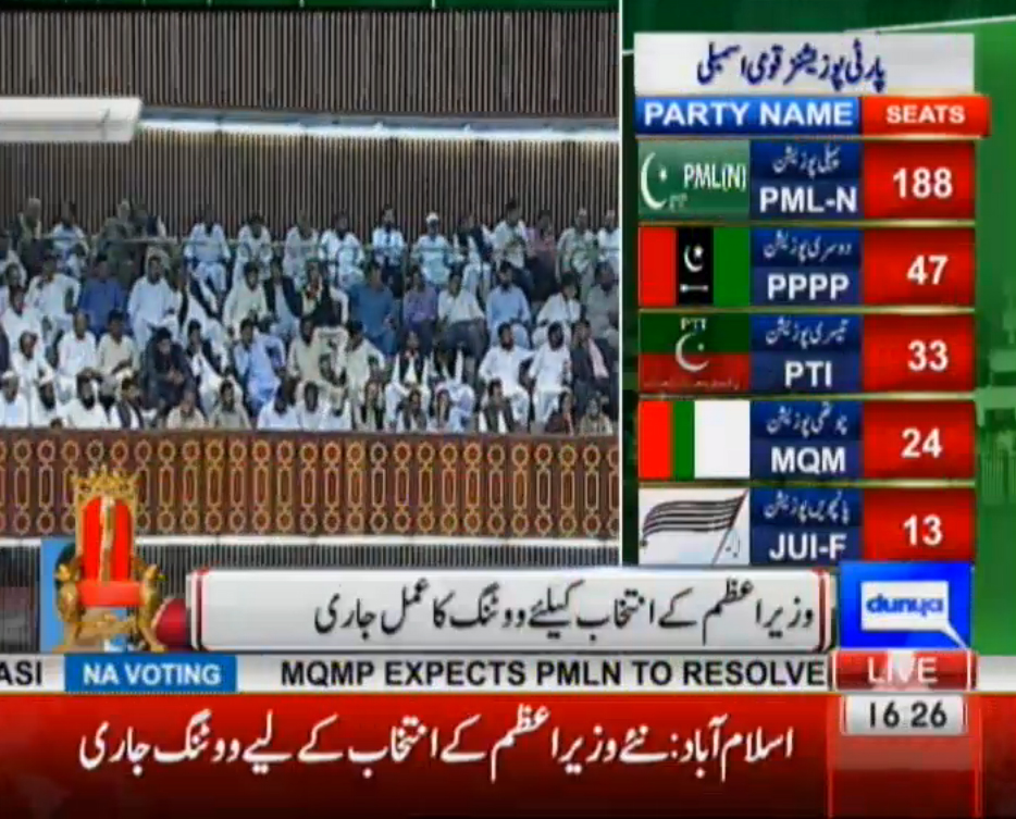 It was earlier told that six candidates will compete for PM position in NA voting, but MQM pledged support to PML-N candidate while PPP withdrew its second candidate which was Opposition Leader Khurshid Shah.