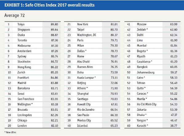 The Safe Cities Index 2017 is a report from The Economist Intelligence Unit sponsored by NEC. The report is based on the second iteration of the index, which ranks 60 cities across 49 indicators covering digital security, health security, infrastructure security and personal security.