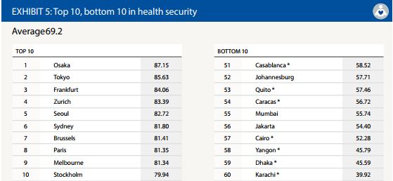 Economist ranks Karachi 54th in terms of digital security and at last (60th spot) in terms of health facilities whereas it ranks 59th when it comes to infrastructure security.