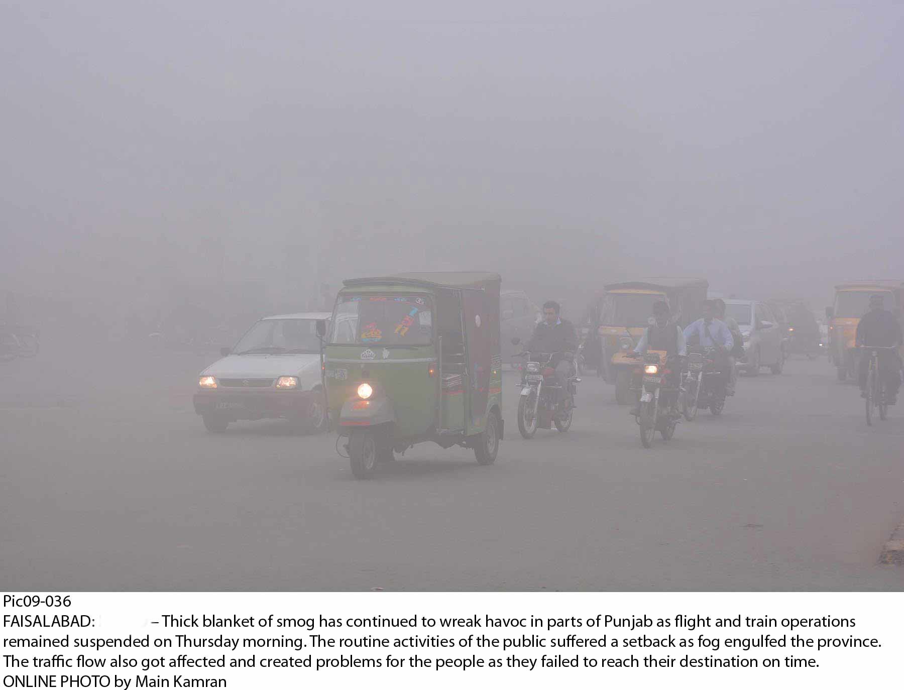 Smog has caused poor visibility, leading to highway accidents. Police spokesman Mohammad Imran said movement on the motorways remains suspended in the morning due to ‘zero’ visibility. He said to avoid accidents traffic moves in escorted convoys during the day.
