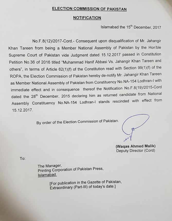 The Supreme Court had announced verdict on PML-N leader Hanif Abbasi’s petition filed in November last year. He accused the PTI leaders Imran Khan and Jahangir Tareen of not declaring complete details of their assets to the ECP.