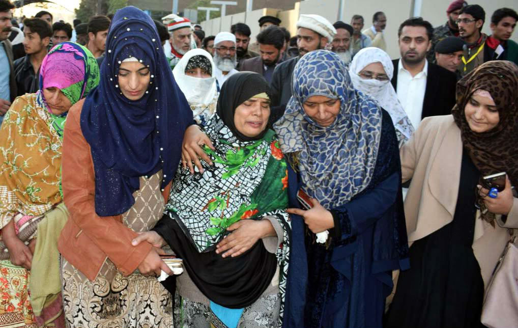 Mother of the minor who was murdered in Kasur weeps while coming out of the Benazir Bhutto International Airport. Photo: OINN