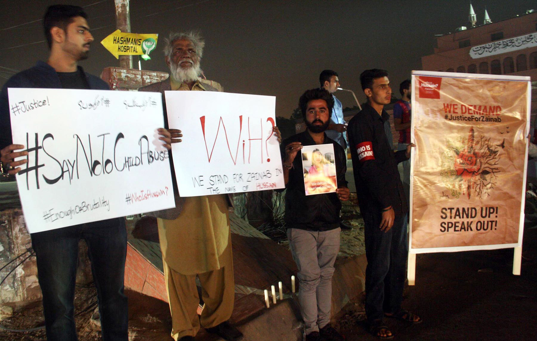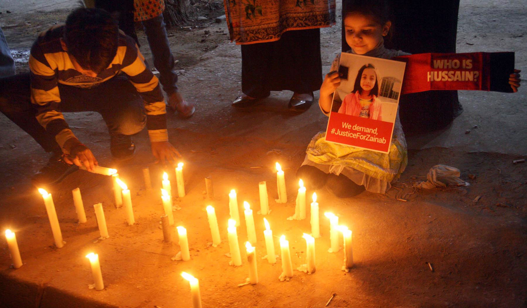 Girl holds placard demanding justice during a candle light vigil in memory of the minor murdered in Kasur. Photo: OINN