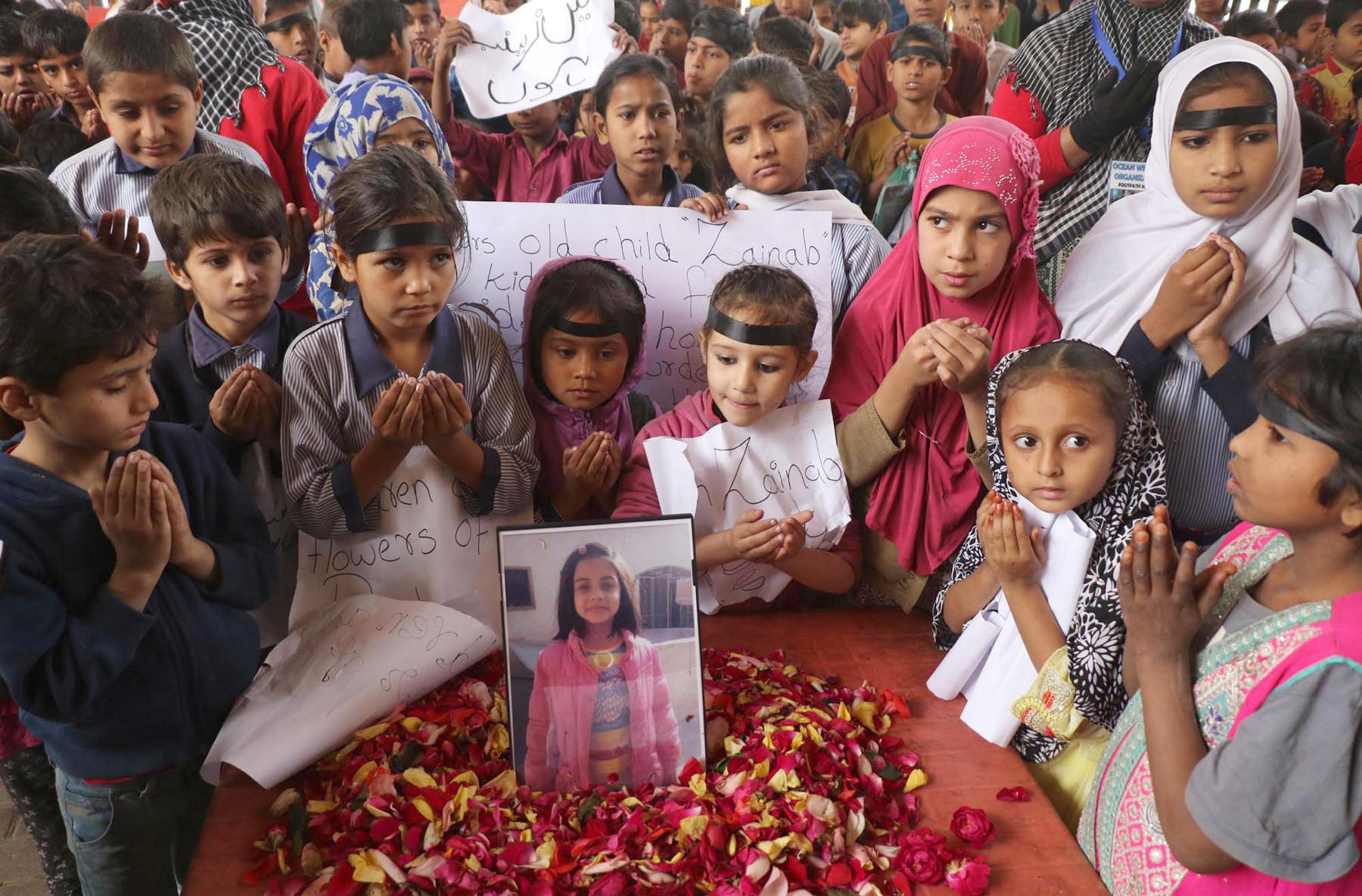 Students in Karachi pray for the departed soul of 7-year-old girl who was brutally raped and murdered in Kasur. Photo: OINN