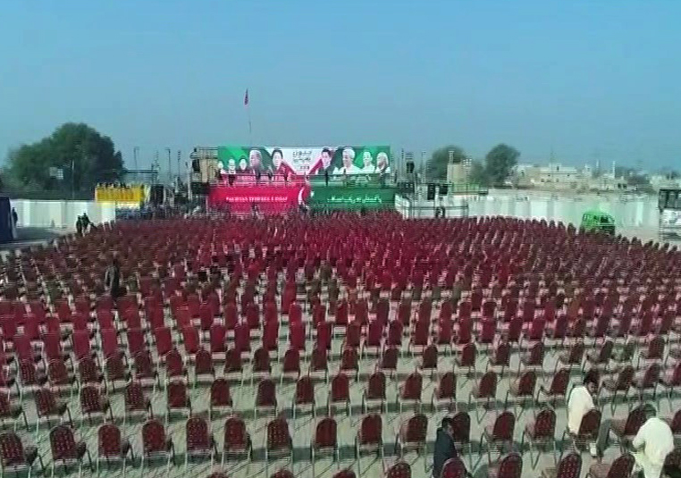 A stage has been set for the party leaders who will address the public including PTI chief Imran Khan.