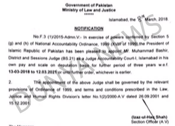 “In exercise of powers conferred by Section 5 (g) and (h) of National Accountability Ordinance, 1999, the President of Islamic Republic of Pakistan has been pleased to appoint Mr. Muhammad Bashir, District and Sessions Judge (BS 21) as a Judge Accountability Court-I, Islamabad in his own pay and scale on deputation basis for further period of three years w.e.f. 10-03-2018 to 12.03.2021 or until further order, whichever is earlier,” states a notification issued today (Thursday) by the Ministry of Law and Justice.