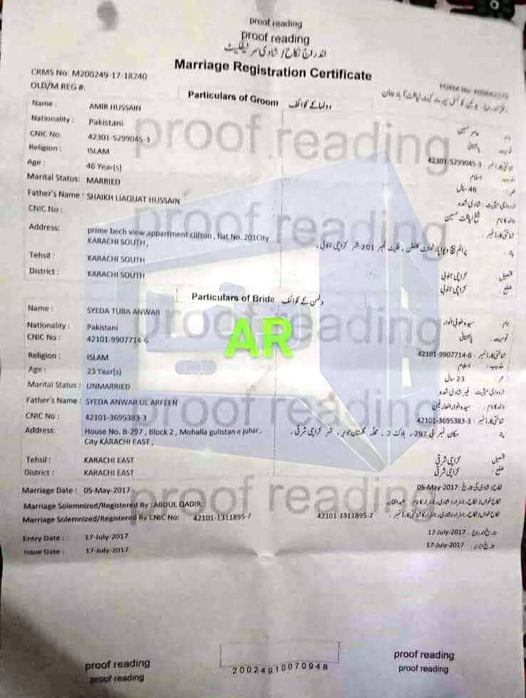 According to the copy of the marriage registration certificate available with the Dunya News, Amir Liaquat 46, secretly wed with the private TV channel’s employee Syed Tooba Anwar 23, in Karachi. The nikahnama got registered with NADRA last year on July 17, 2017.