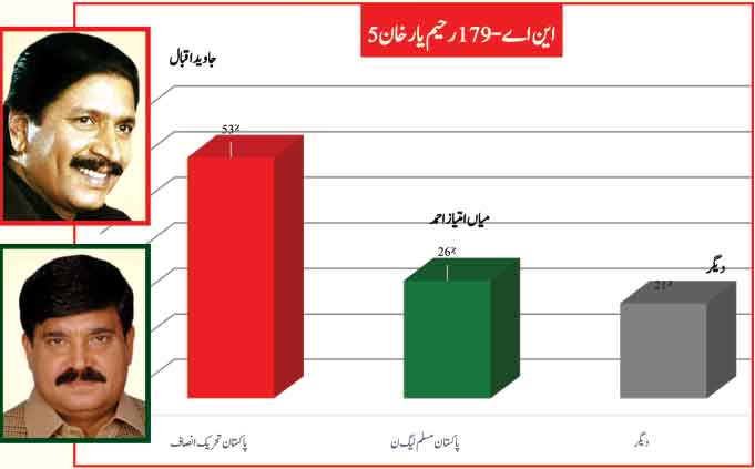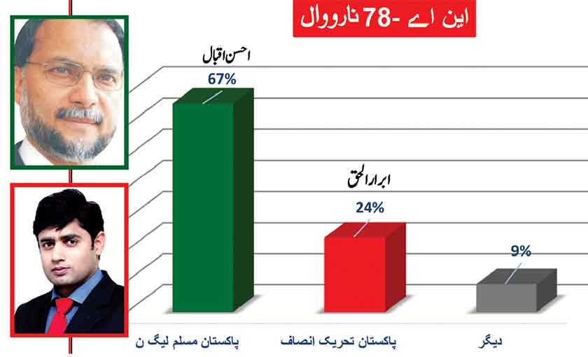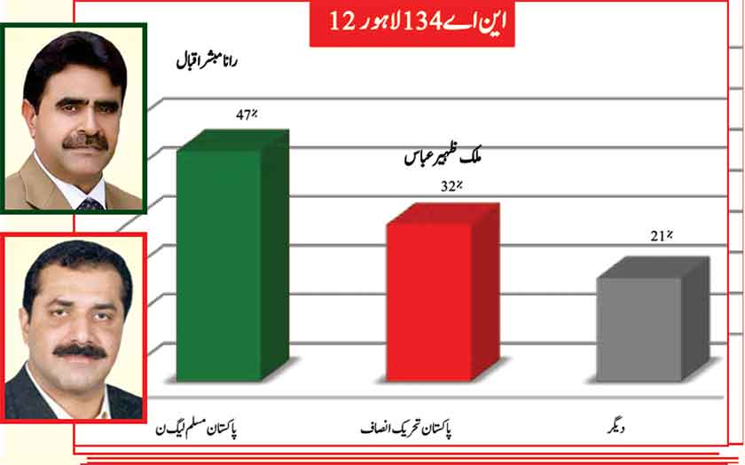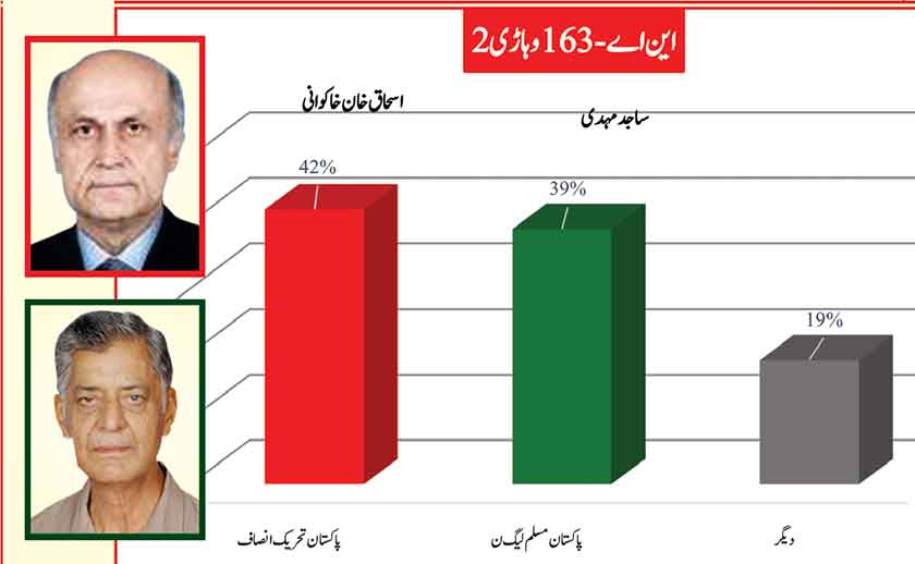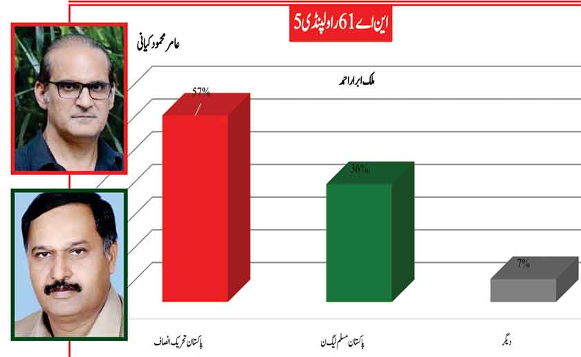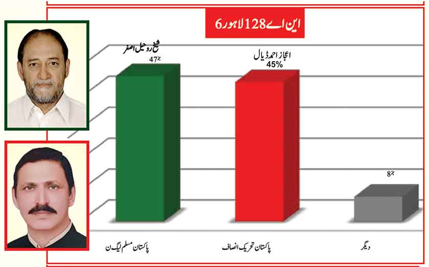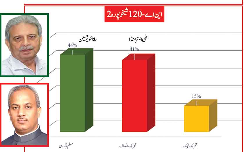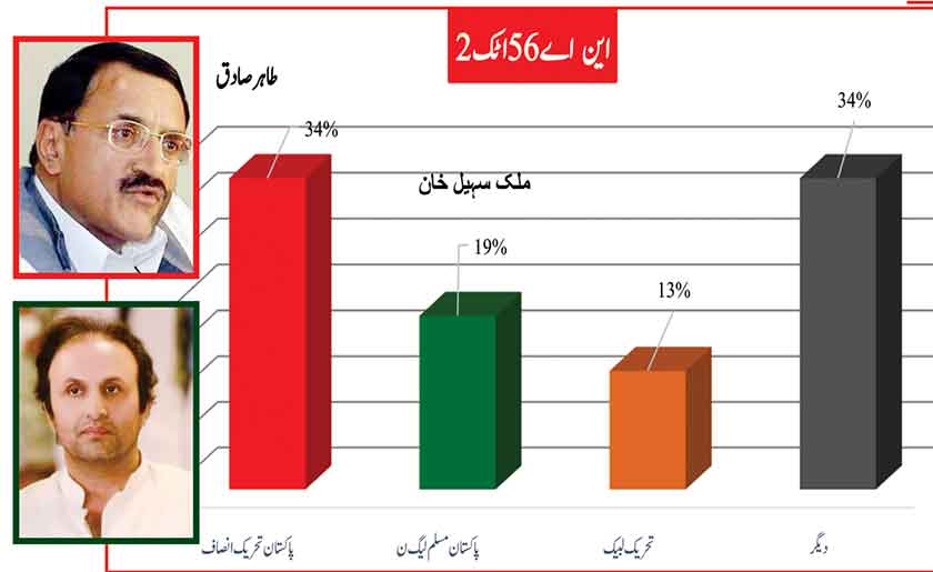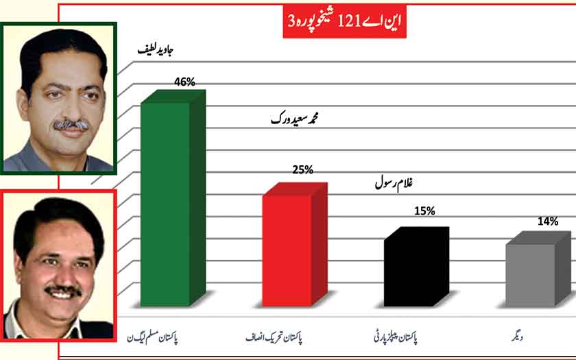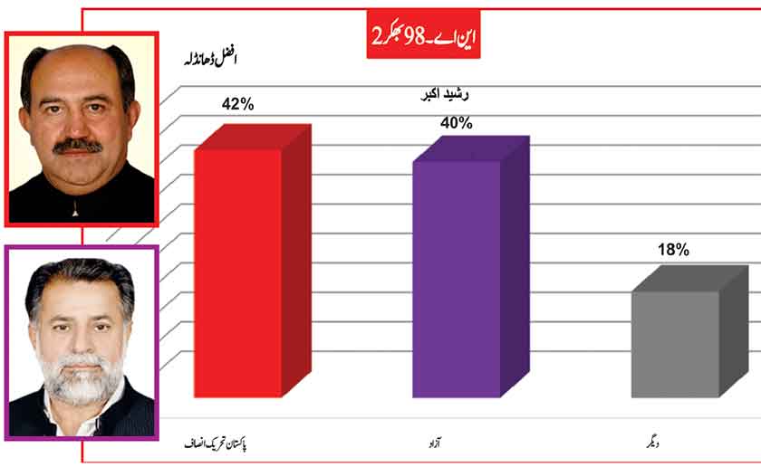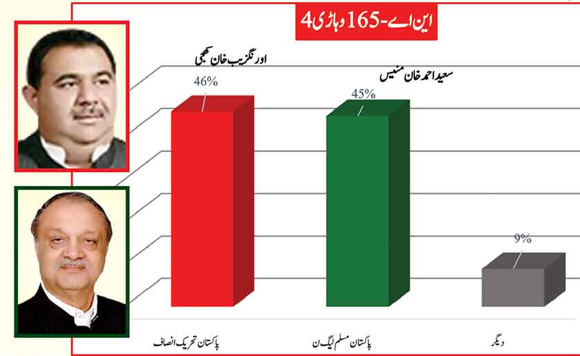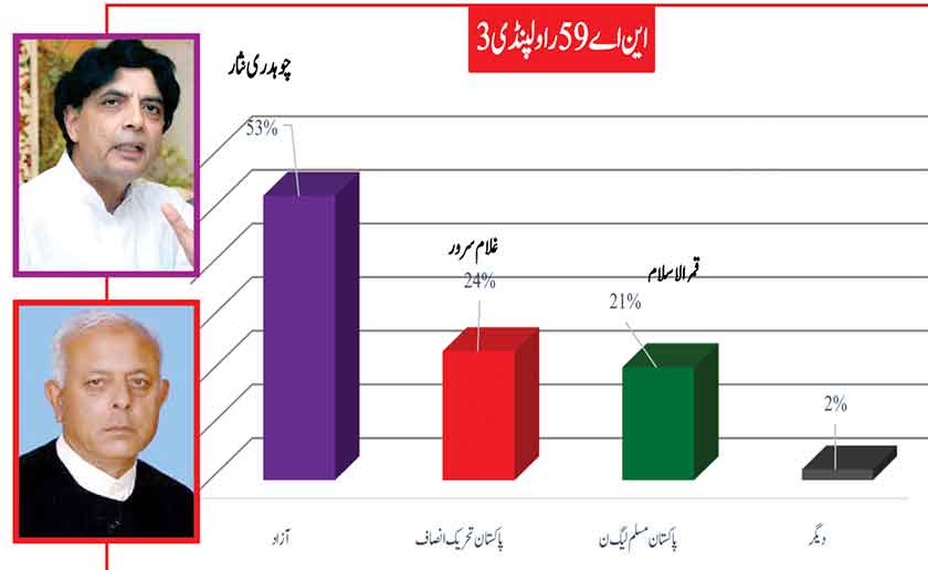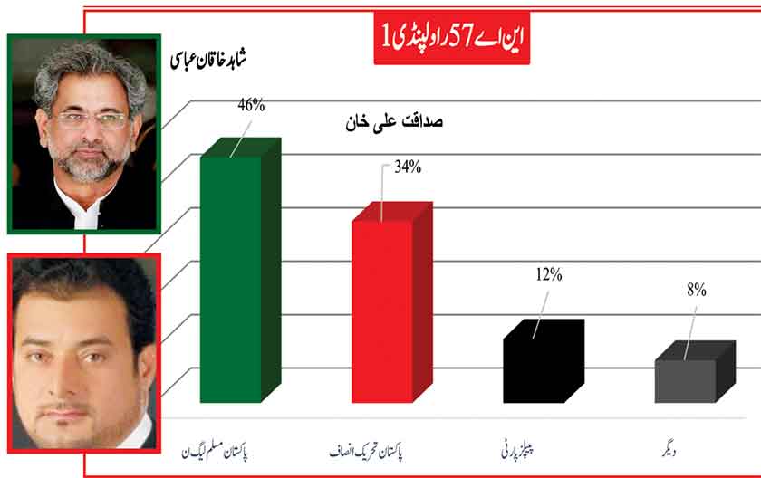 Awami Muslim League’s Sheikh Rasheed withthe support of PTI dominates with 52% mass support followed by PMLN Hanif Abbasi with 46%.