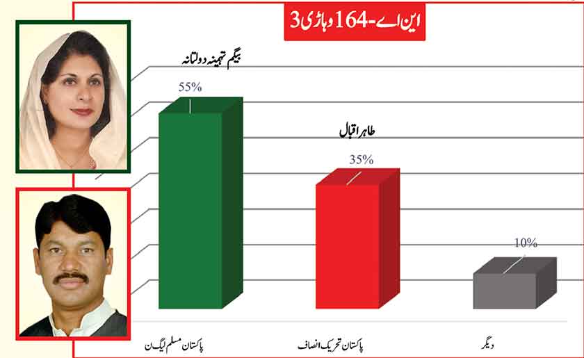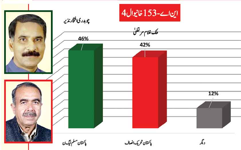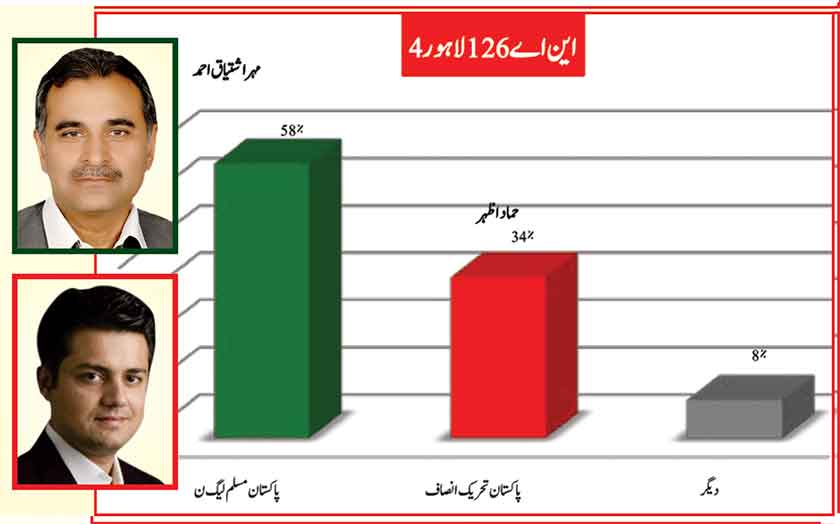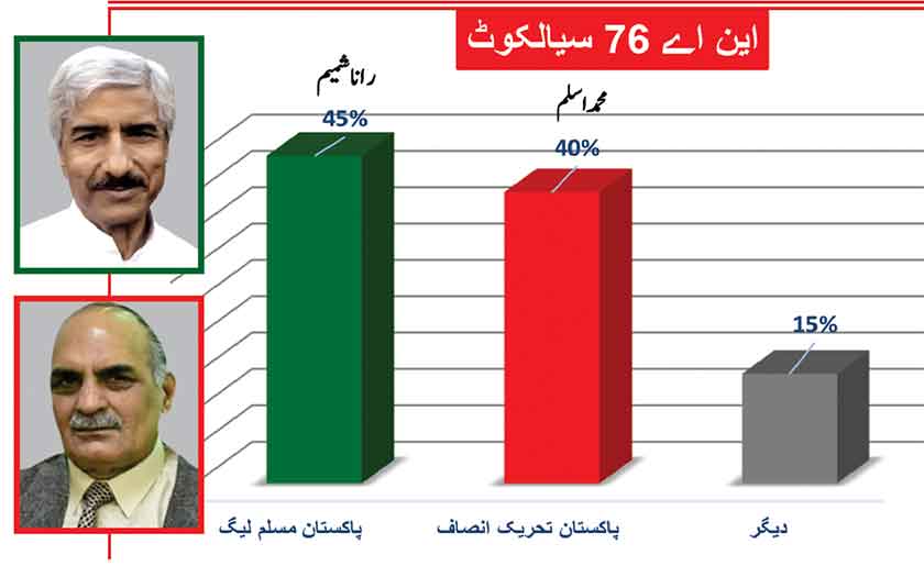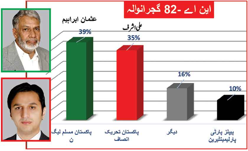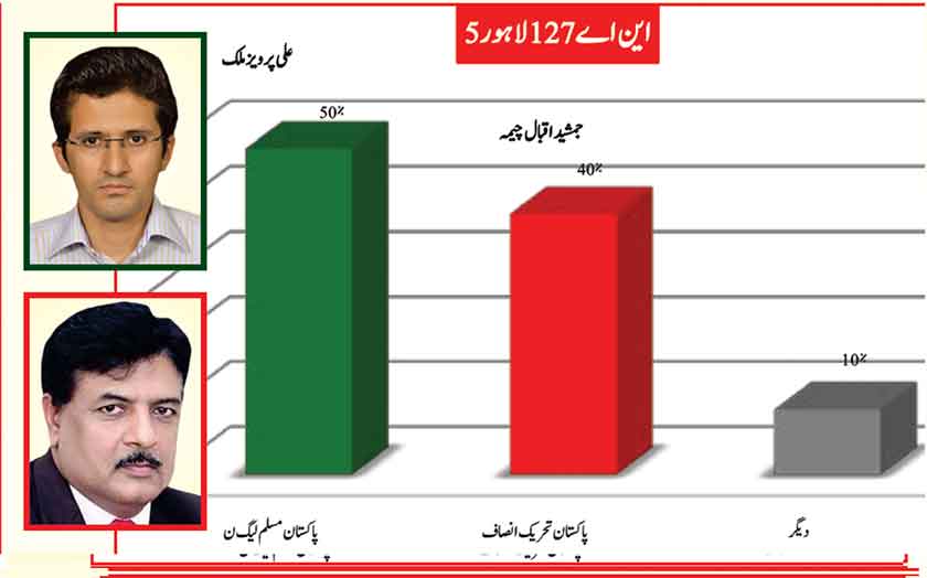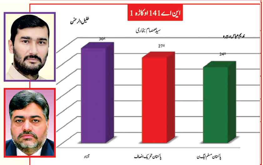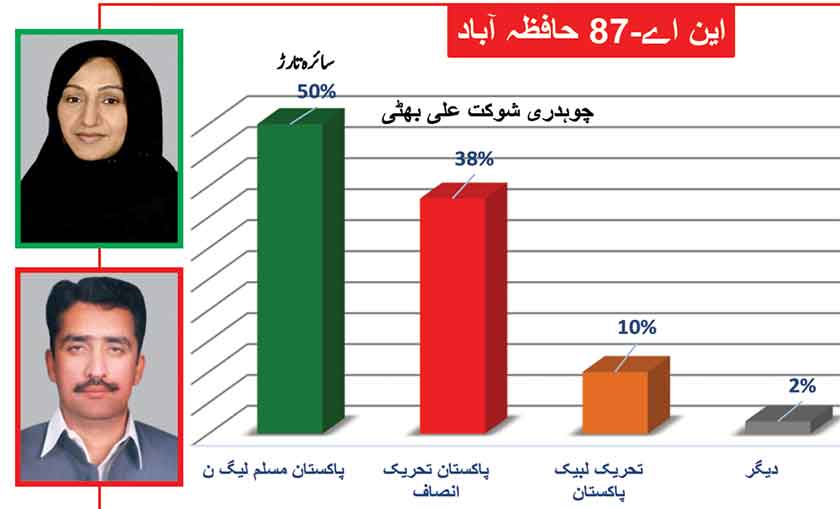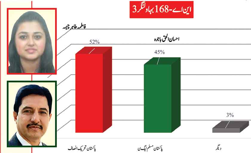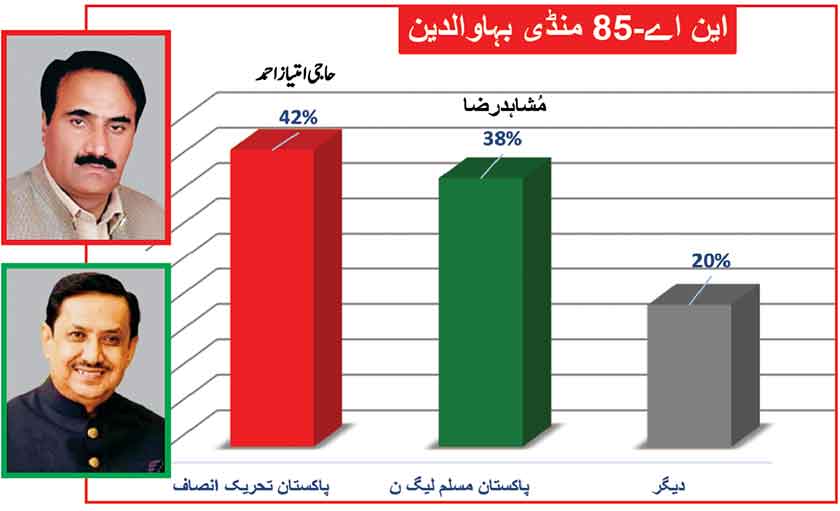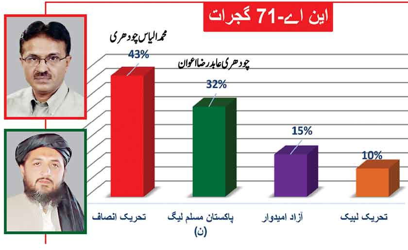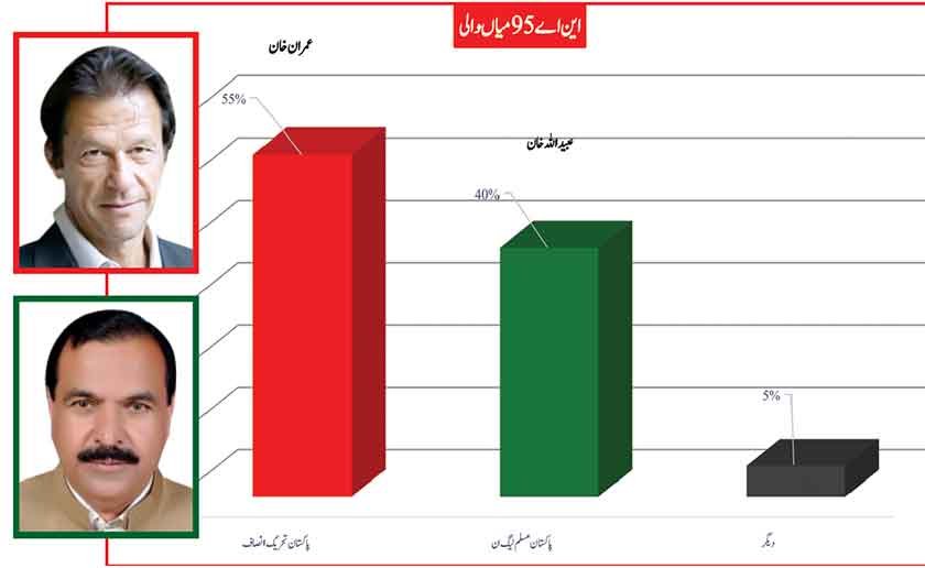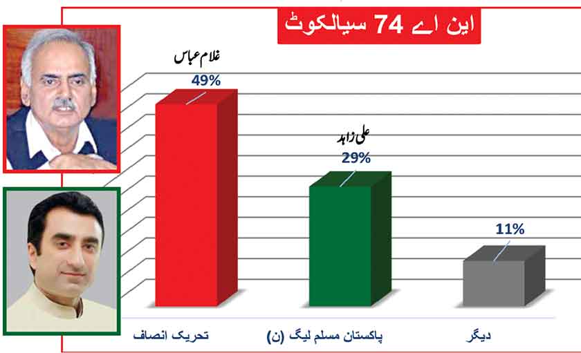 Awami Muslim League’s Sheikh Rasheed withthe support of PTI dominates with 52% mass support followed by PMLN Hanif Abbasi with 46%.