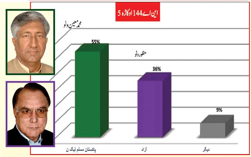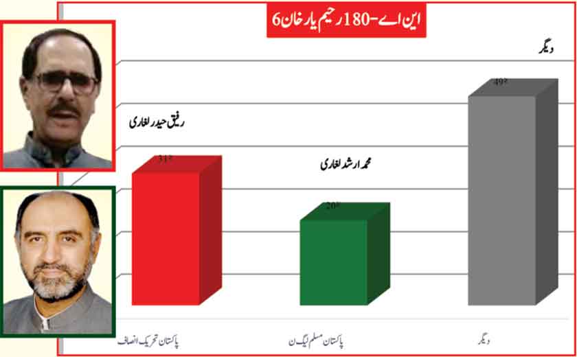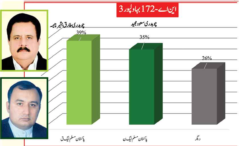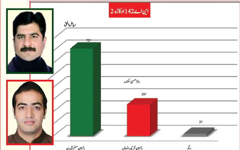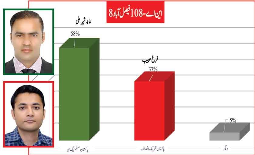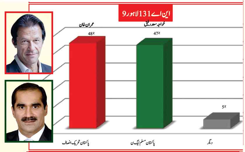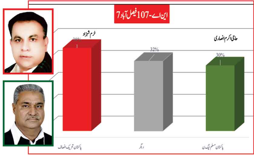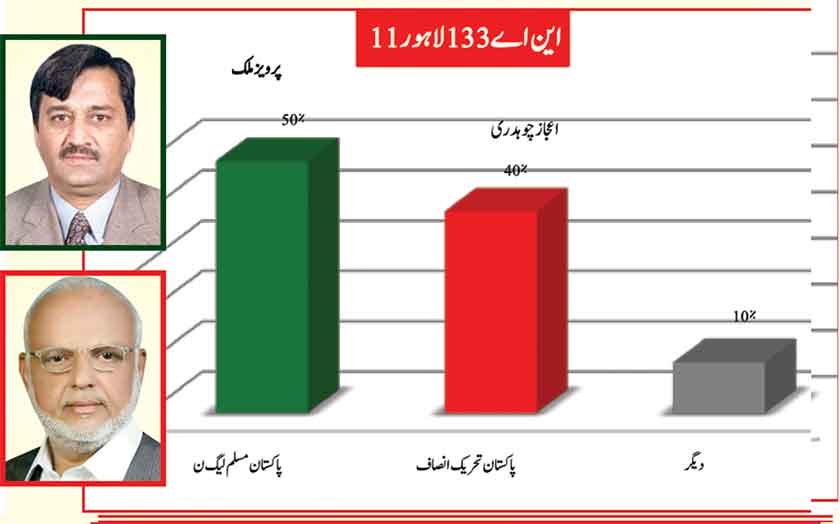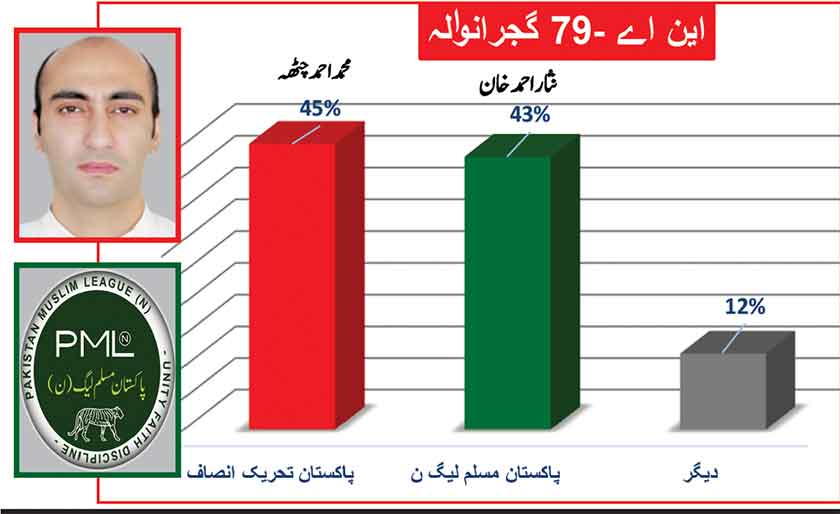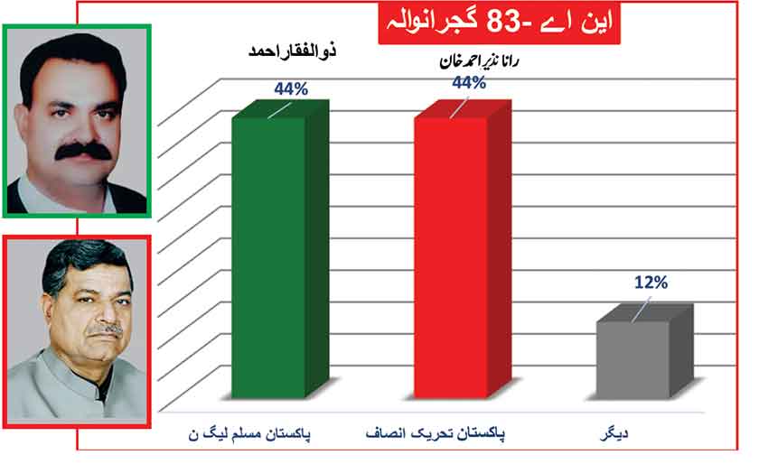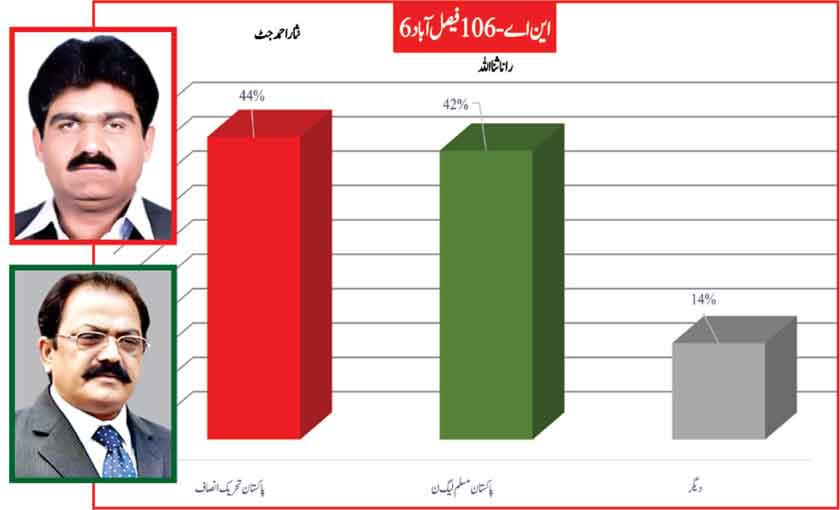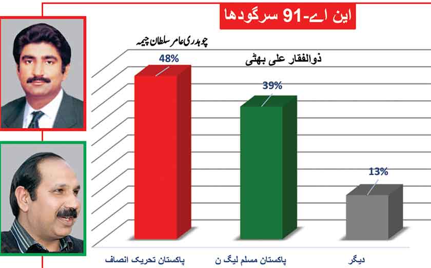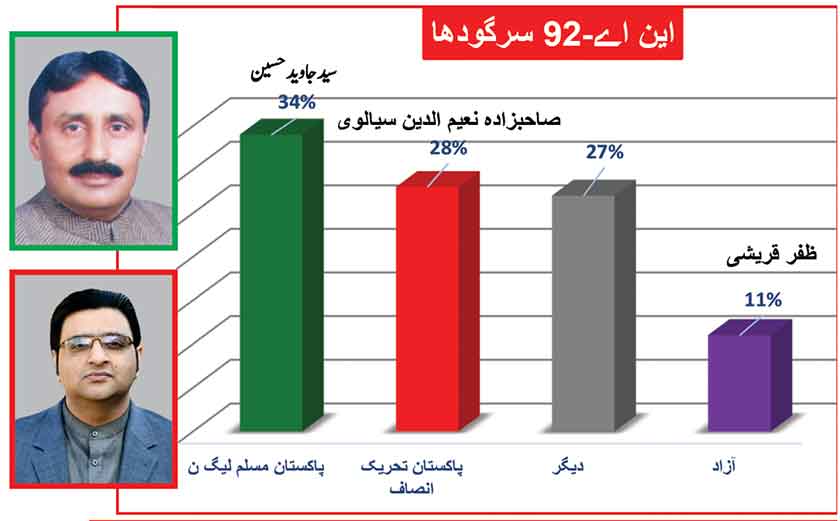 Awami Muslim League’s Sheikh Rasheed withthe support of PTI dominates with 52% mass support followed by PMLN Hanif Abbasi with 46%.