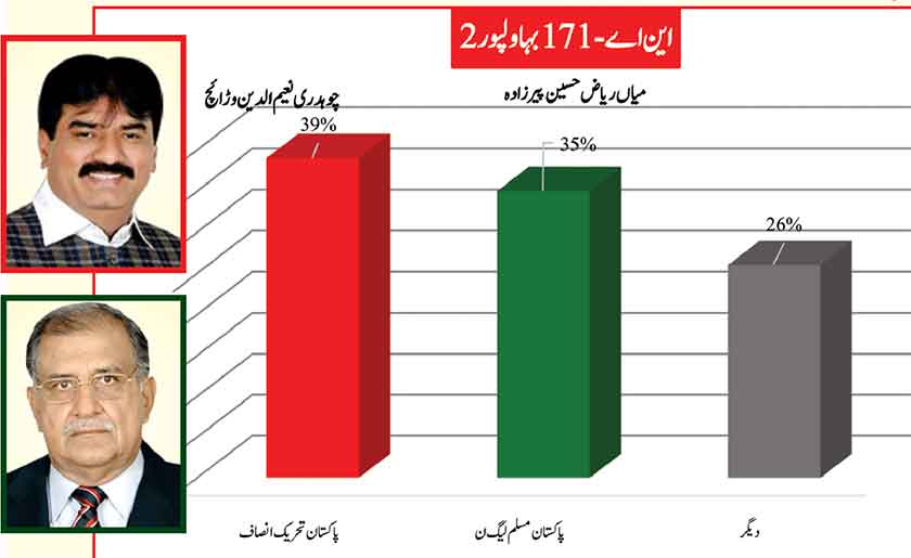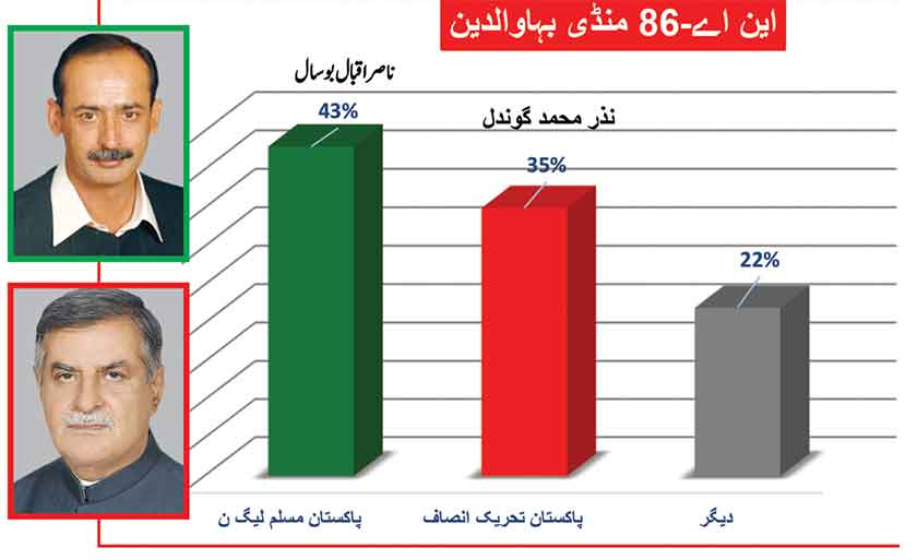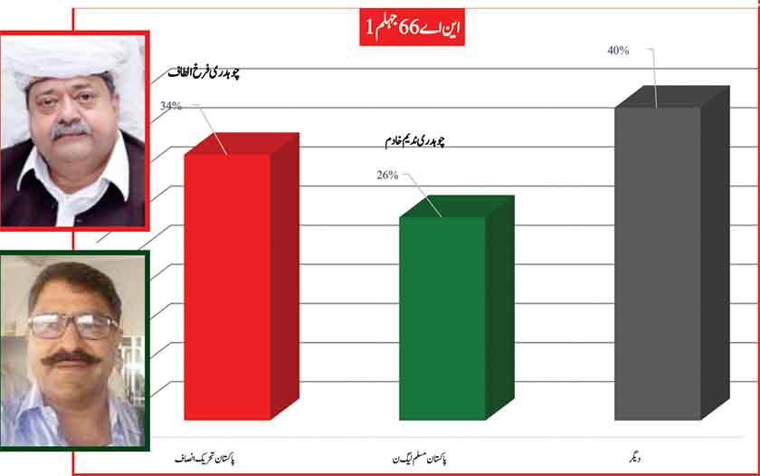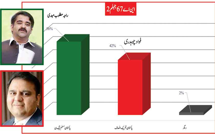 Peeved leader of PMLN now as an independent with the electoral symbol of Jeep, leads substantially in his home ground of Chakri with 53 % followed by Ghulam Sarwar of PTI with 24% and detained by NAB, PMLN contestant Engineer Qamrul Islam with 21%.