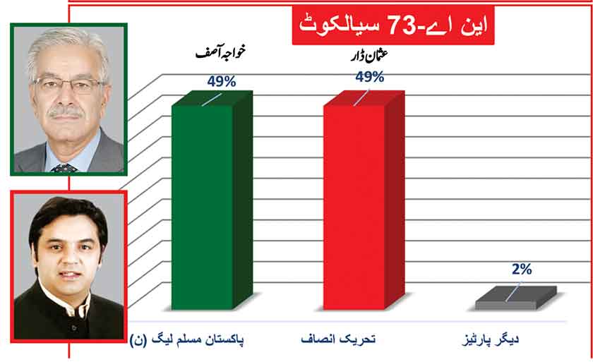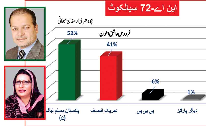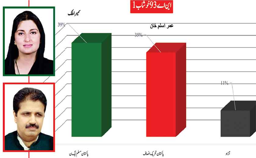 PTI leader Asad Omer with 52% is quite ahead of PMLN’s Anjum Aqeel with 43% support of the people of constituency.