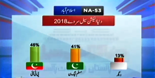 According to the survey in NA-53, PTI chairman Imran Khan is leading in popularity with a support of 46% of voter. PMLN’s political heavy weight and former Primer Shahid Khaqan Abbasi with a little less margin of 5% is on second position with 41%. Others in total comprise 13% support in total.