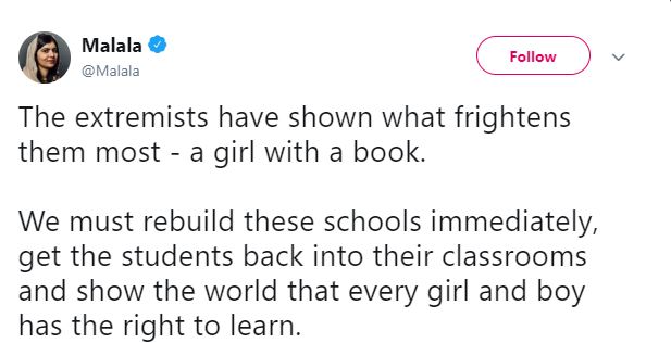 Malala took to popular micro-blogging website Twitter and said, “The extremists have shown what frightens them most – a girl with a book. We must rebuild these schools immediately, get the students back into their classrooms and show the world that every girl and boy has the right to learn.”