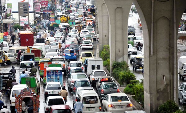 RAWALPINDI: A view of traffic jam on Murree road during downpour.