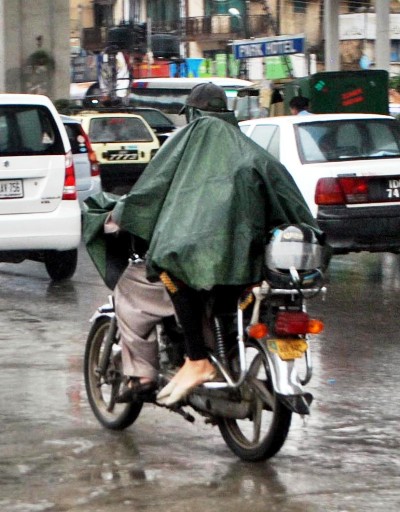 RAWALPINDI: A motorcyclist on the way under the cover of raincoat during downpour.