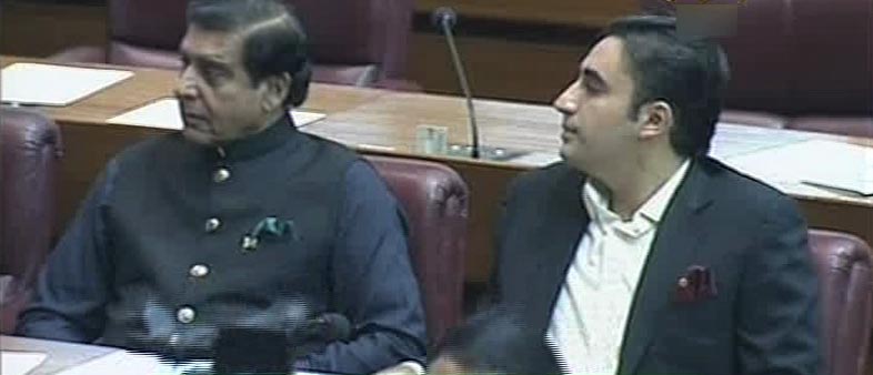 Imran Khan and Bilawal Bhutto seated during NA session. --- Dunya News screengrab