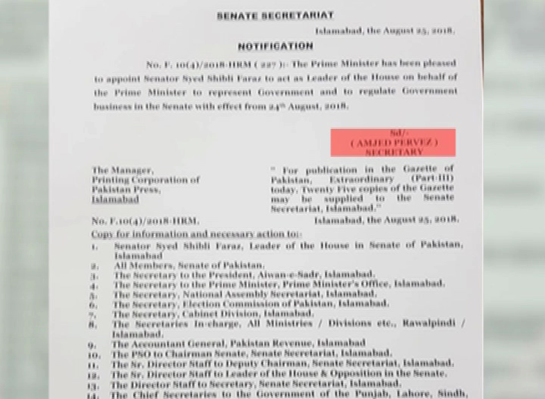 Pakistan Tehreek-i-Insaf (PTI) candidate Senator Shibli Faraz has also been appointed as new Leader of the House in the Senate.