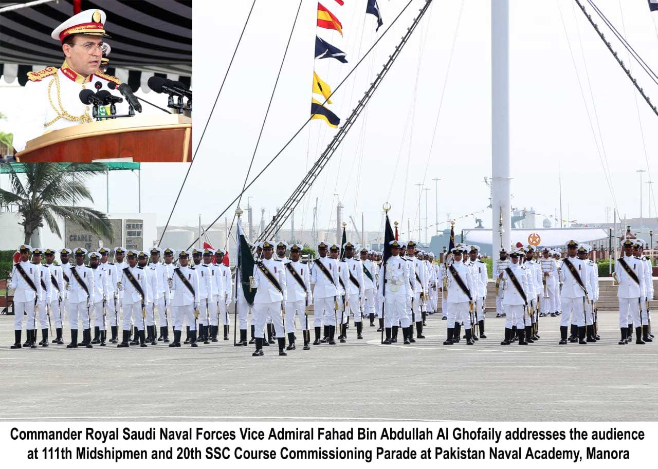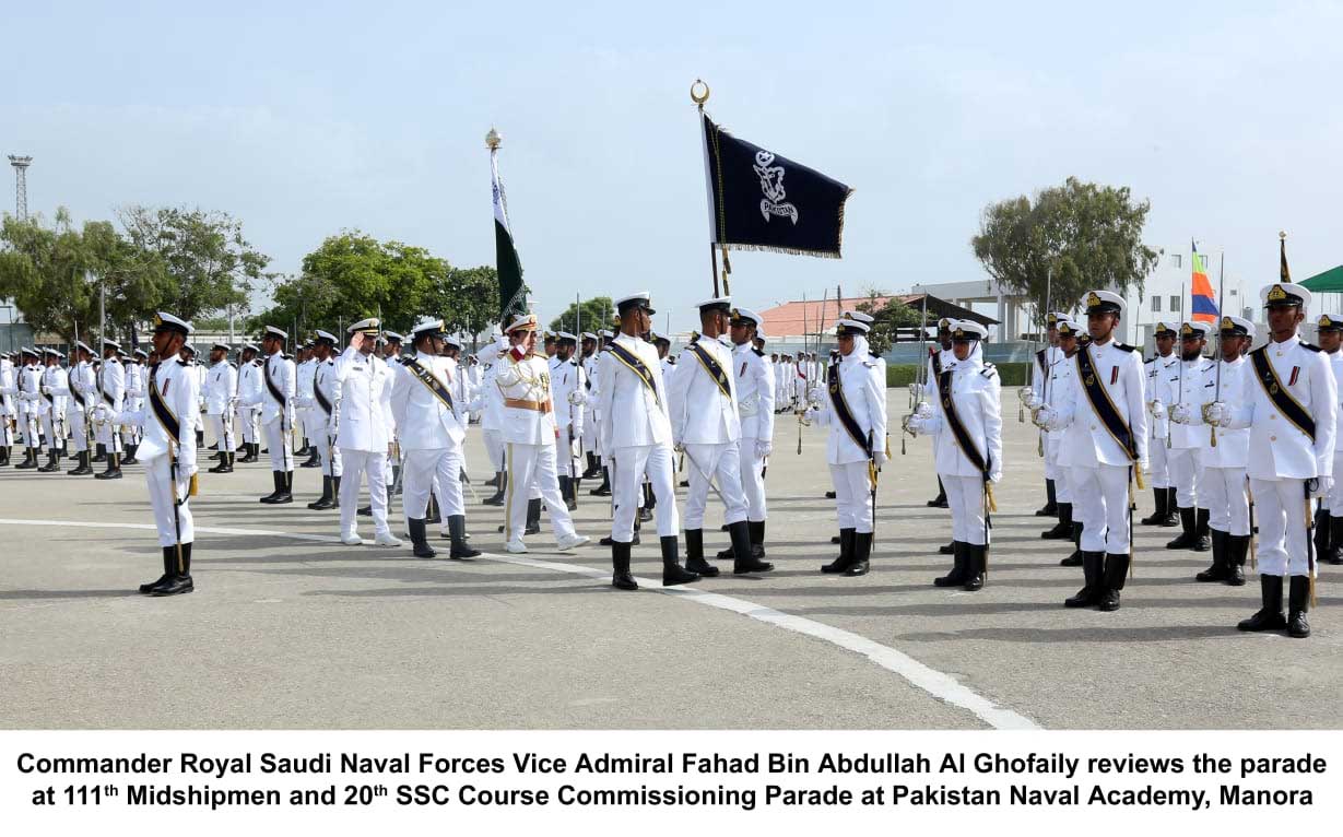 KARACHI (Dunya News) - 111th Midshipmen and 20th Short Service Commission (SSC) Course Commissioning Parade was held at Pakistan Naval Academy PNS RAHBAR. The Commissioning Parade comprised 65 Pakistani and 12 Midshipmen from friendly countries as well as 98 Cadets of Short Service Commission Course including 25 female Cadets. Commander Royal Saudi Naval Forces (RSNF) Vice Admiral Fahad Bin Abdullah Al-Ghofaily graced the occasion as Chief Guest. Upon his arrival, the Chief Guest was received by the Chief of the Naval Staff, Admiral Zafar Mahmood Abbasi.