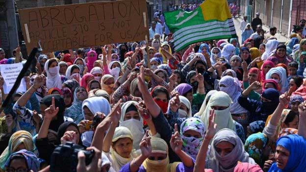 Hurriyat leaders have called for all Kashmiris to leave their homes after Friday prayers, calling for a strong protest against India’s unconstitutional move, in which thousands of Kashmiri men, women, elders and children took to the streets raising flags of Pakistan and chanting Shahada “Allah is one”.