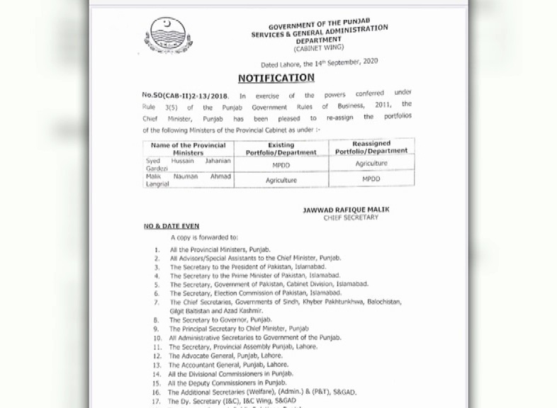 LAHORE (Dunya News) – Punjab government on Monday swapped portfolios of two cabinet ministers with immediate effect and notification in this regard has been issued, Dunya News reported.