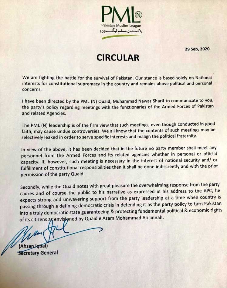 According to a circular issued on Tuesday, PML-N Secretary General Ahsan Iqbal said, “If, however, such meeting is necessary in the interest of national security and/ or fulfillment of constitutional responsibilities then it shall be done indiscreetly and with the prior permission of the party Quaid.”