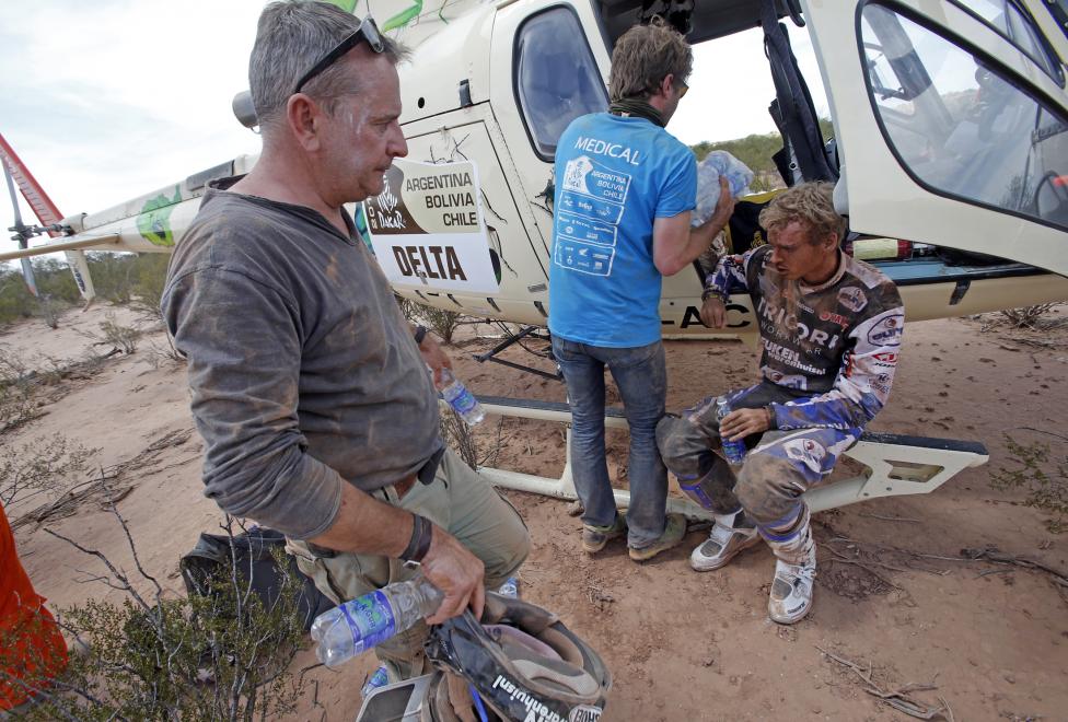 Dakar Rally director Etienne Lavigne (L) and a doctor give medical assistance to a rider during the 2nd stage of the Dakar Rally 2015 - Reuters