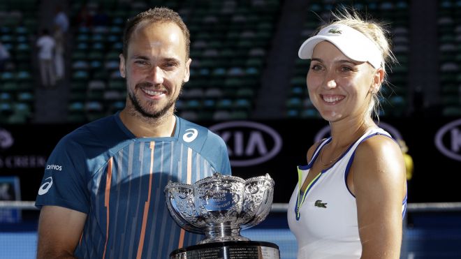 MELBOURNE (AFP) - Brazil s Bruno Soares lifted the Australian Open mixed doubles trophy on Sunday -- the same day he also won the men s doubles, in the early hours of the morning.