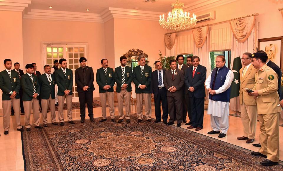 Summary The winning hockey team of SAF Games called on Prime Minister Nawaz Sharif in Islamabad.