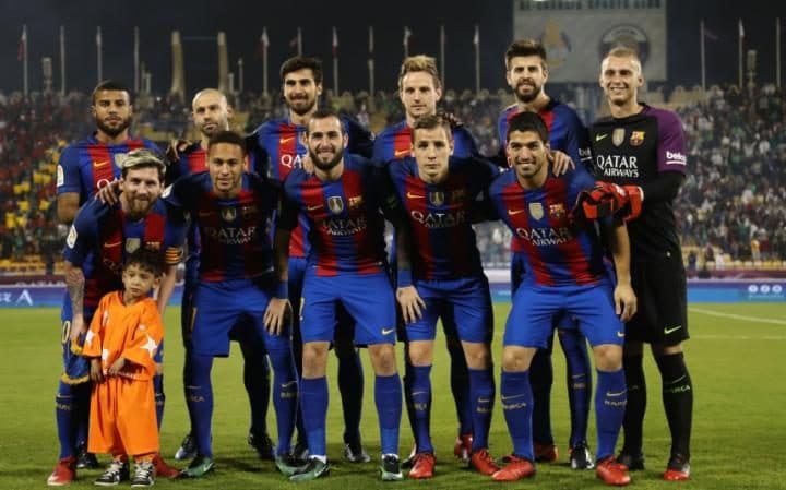 Barcelona team poses just ahead of the match along with Murtaza Ahmadi