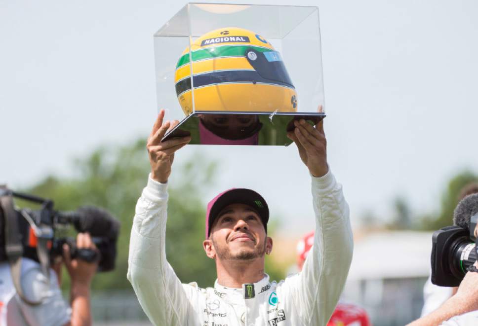 The helmet -- Senna’s 1987 season helmet when he was racing for Lotus-Honda -- was cradled by the Briton as he returned to his team garage.