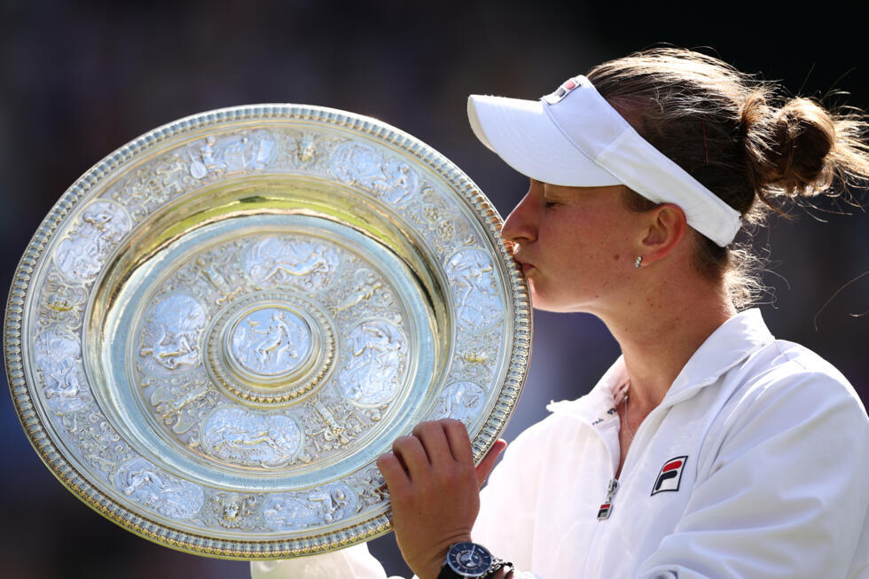 Barbora Krejcikova celebrates her 2024 Wimbledon triumph.