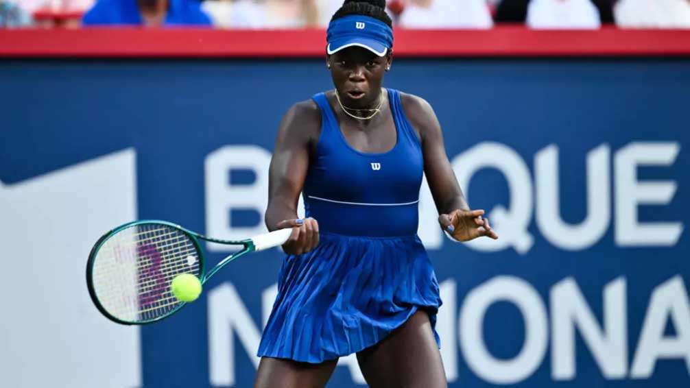 Canadian Victoria Mboko plays a forehand on the way to a semi-final victory over Kazakhstan's Elena Rybakina in the semi-finals of the WTA Canadian Open in Montreal.