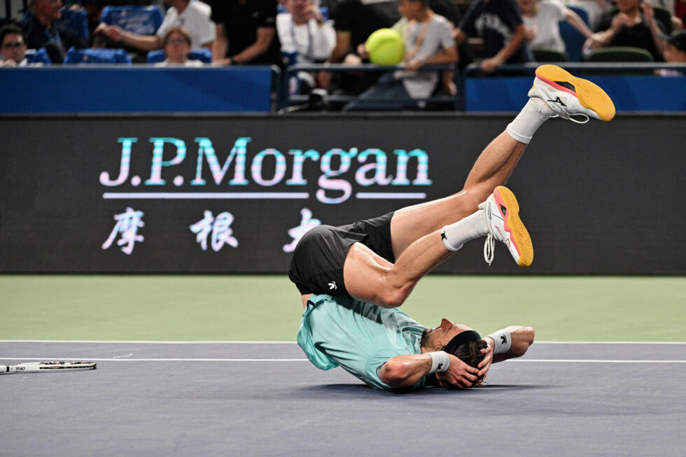 France's Arthur Rinderknech celebrates after winning against Russia's Daniil Medvedev at the end of their men’s singles semi-final match during the Shanghai Masters tennis tournament in Shanghai.