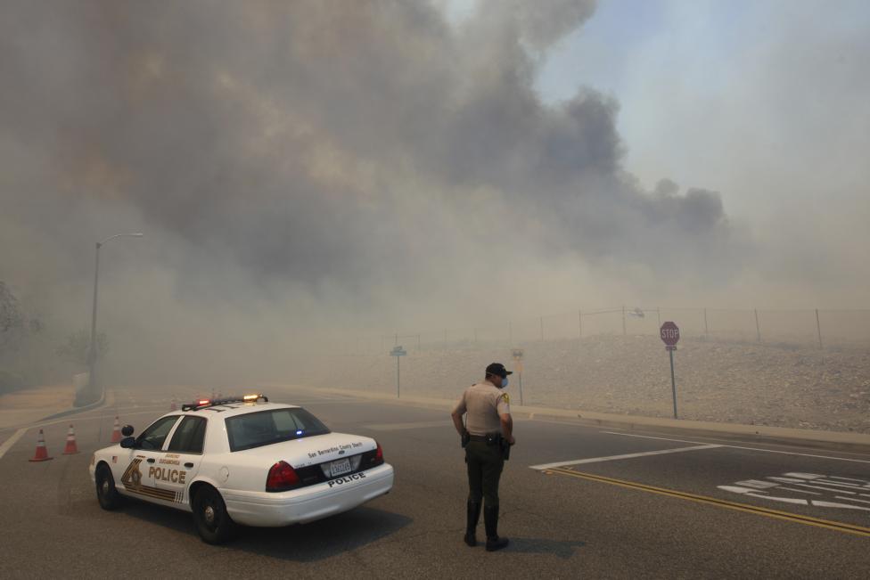 A police officer mans a roadblock as smoke billows from a wildfire driven by fierce Santa Ana winds in Rancho Cucamonga, California - Reuters