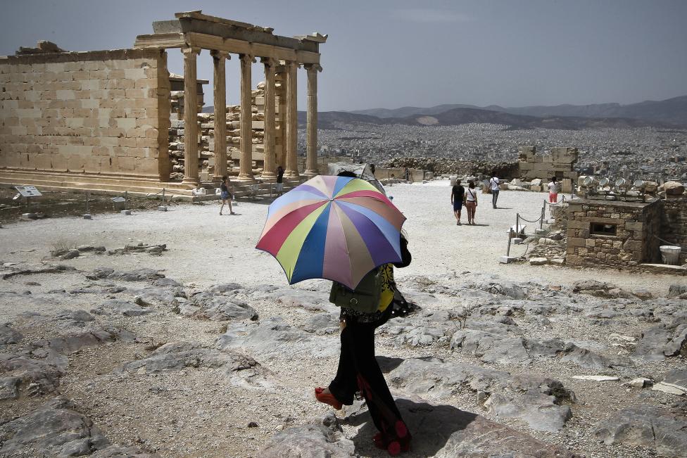 A tourist holds an umbrella to protect from the sun as she walks in front of the Erechtheion temple on the Acropolis Hill in Athens - Reuters