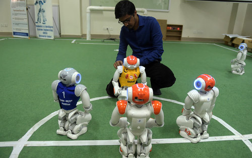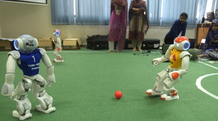 Students tap away at their laptops in their university lab, programming their code. Zain Murtaza, who leads the ten-member team, sets up the cute robots on their nine-by-six feet pitch, and the action begins.