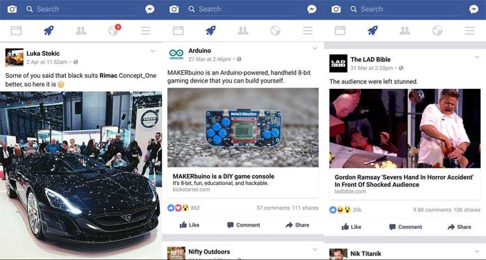 Just like in Instagram’s explore tab, the Facebook’s rocketfeed will engage people further with new people and content. Unlike newsfeed, it has large icons or thumbnails which look more exciting.
