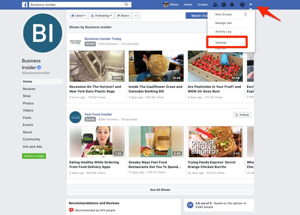1. Find and click on the upside-down triangle in the top right corner of any Facebook page.