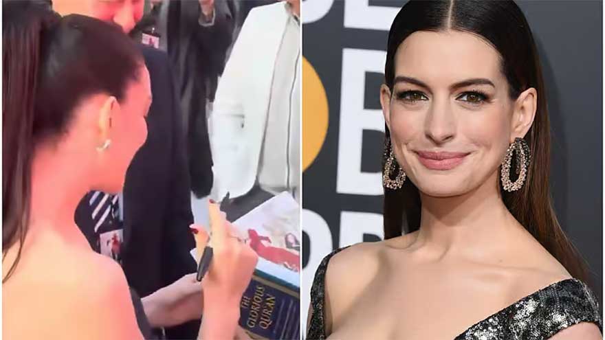 In a video circulating online, a fan hands Hathaway a copy of the Quran, which she appears to accept politely while continuing along the carpet.