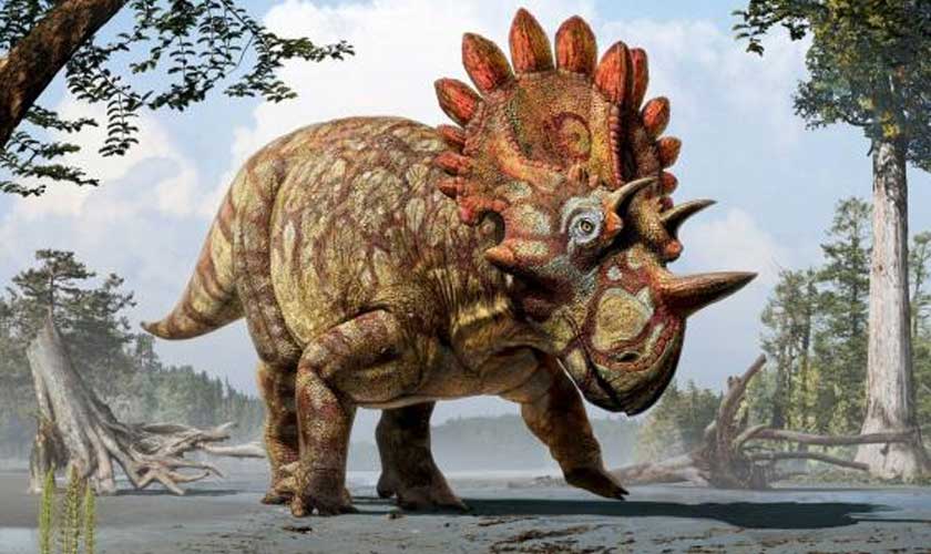 It possessed a large conical horn over its nose and a pair of small, forward-curving horns over its eyes that were puny compared to its bigger close relative, Triceratops. Seven bony spines in triangular and pentagonal shapes formed a halo around the edge of its large shield-like frill.