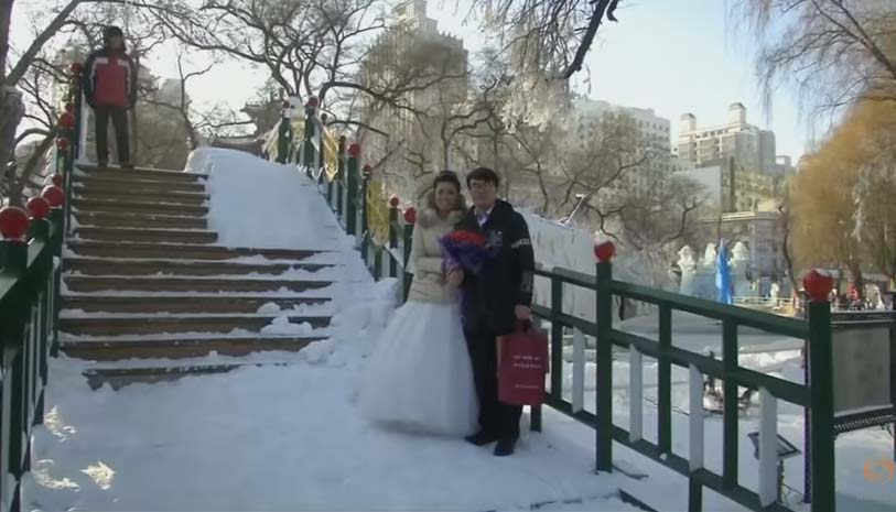 In one of the coldest cities in China, the couples, dressed in anoraks over their wedding dresses and suits, said their vows and exchanged rings in temperatures as low as minus 20 degrees celsius.