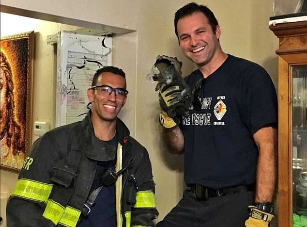 Broward County Sheriff’s Office Fire Rescue spokesman Mike Jachles says several firefighters on Monday safely removed the small gray kitten after cutting a hole through the wall in the Deerfield Beach family’s living room. The kitten didn’t appear to be injured.